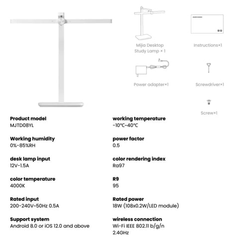 Xiaomi MJTD08YL LED desk lamp delivers professional-grade illumination with a dual-wing rectangular design for expansive, uniform light coverage. Certified for superior color accuracy with Ra97 rendering index and R9 value of 95, ensuring true-to-life color representation ideal for detailed work. Operating at 4000K neutral white temperature, this 18W lamp combines energy efficiency with high-output performance. Features smart connectivity compatible with Android 8.0+ and iOS 12.0+, allowing convenient control via mobile devices. Built to exacting standards with 0.5A rated input and optimized power factor, this lamp merges precision engineering with practical functionality for professionals demanding reliable, flicker-free illumination.