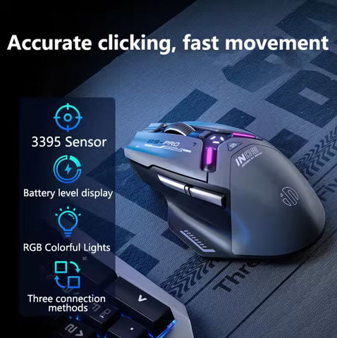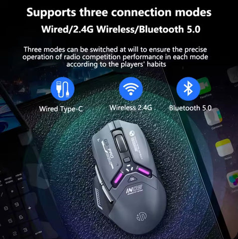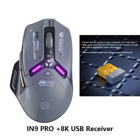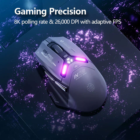 The Inphic IN9PRO gaming mouse combines versatility with high-performance gaming capabilities. Powered by a 500mAh rechargeable battery with Type-C charging, it seamlessly switches between 2.4G wireless, Bluetooth, and wired modes to adapt to any setup. Advanced gaming chips paired with 8K polling rate support (receiver sold separately) deliver ultra-responsive gameplay. Choose from 6 DPI levels ranging from 800 to 26,000 for precision control across competitive gaming and everyday tasks. Durable micro-switch buttons and programmable functionality enable customization, while three battery indicator lights keep you informed of power status. Built for serious gamers and professionals demanding reliability and adaptability.