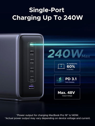 | USB-C1 Output | 5.0V=3.0A / 9.0V=3.0A / 12.0V=3.0A / 15.0V=3.0A / 20.0V=5.0A / 28.0V=5.0A / 36.0V=5.0A / 48.0V=5.0A 240W Max |