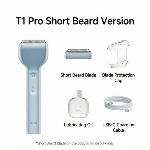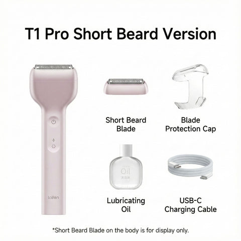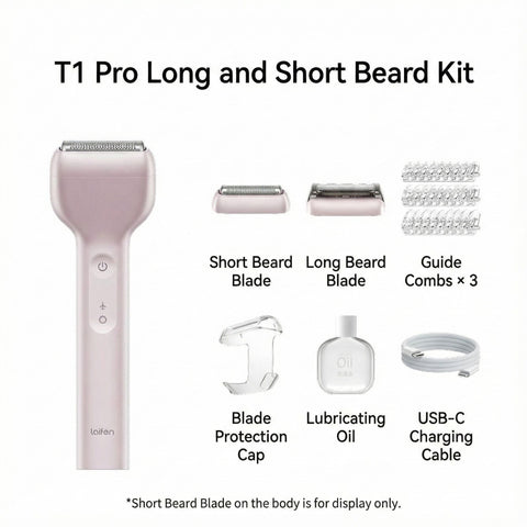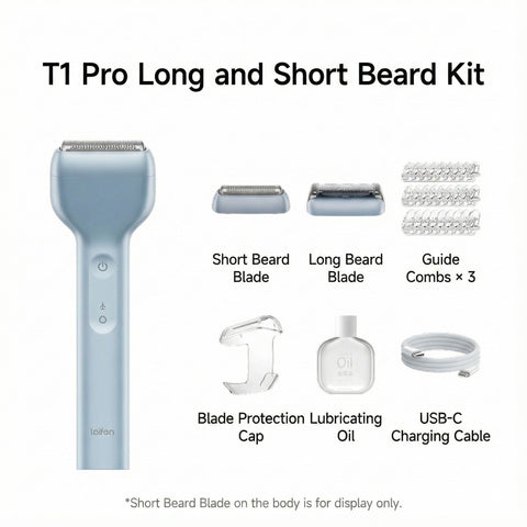 The Laifen T1 Pro linear reciprocating shaver features a high-speed linear motor L1 developed in-house, operating at 195±10Hz for efficient and precise shaving. The main unit with the long beard blade measures 145×46×21.5 mm and weighs 98 g, while the short beard blade is compact at 46×16×14.3 mm, with the main unit plus short blade weighing 93 g. The lightweight design, combined with advanced motor technology, ensures powerful performance and comfortable handling for a superior grooming experience.