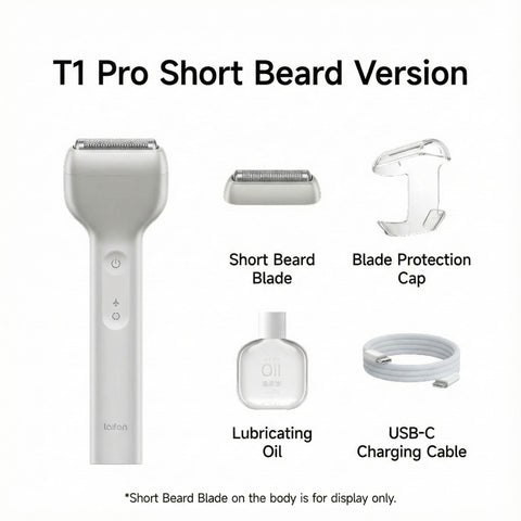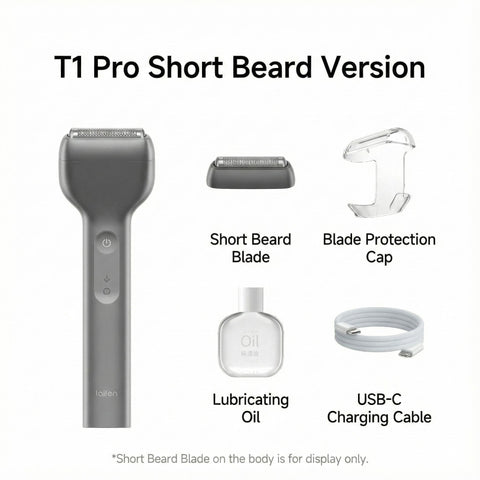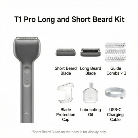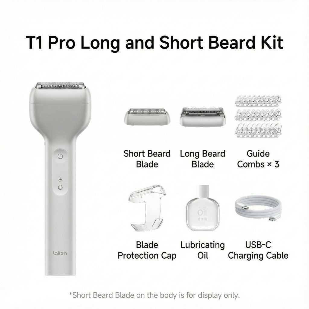 The Laifen T1 Pro shaver offers a magnetic cutting head connection for effortless blade swaps. It charges via USB-C in approximately one hour, powered by a 530mAh battery that delivers up to 120 minutes of use. The Standard Edition includes the aluminum alloy body, short beard blade, blade protection case, USB-C cable, instruction manual, quick start guide, and warranty card. The Long Beard Set adds a long beard blade, three guide combs (2mm, 3mm, 5mm), and lubricant, providing comprehensive grooming versatility with premium components designed for expert performance.