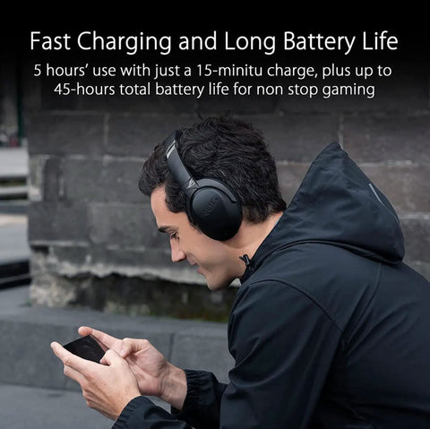The ASUS ROG Strix Go BT Gaming Headset supports Virtual 7.1 surround sound via Windows Sonic, delivering precise positional audio for enhanced gameplay. Its super-fast charging provides up to 5 hours of use from just a 15-minute charge, with a total battery life reaching 45 hours for uninterrupted gaming sessions. Equipped with exclusive airtight chambers and 40 mm ASUS Essence drivers, it offers rich, pure sound with deep bass. Versatile connectivity options include Bluetooth® and a 3.5 mm audio cable, compatible with PCs, smartphones, PlayStation®, Xbox®, and Nintendo Switch™, ensuring seamless audio across devices.