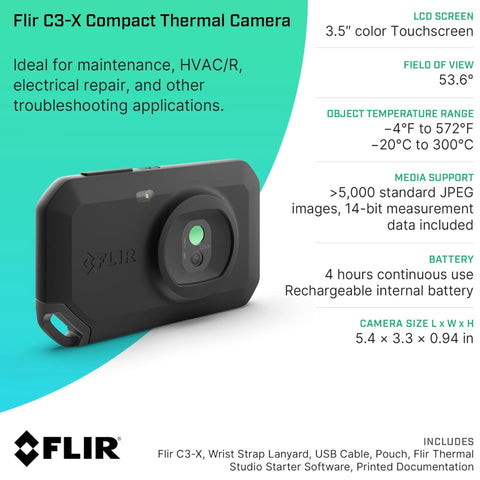 The FLIR C3-X delivers professional-grade thermal imaging in a compact, portable format. With WiFi connectivity, instantly share thermal images and videos to your smartphone or computer for real-time analysis. The camera's -20 to +300°C temperature range makes it ideal for electrical inspections, HVAC diagnostics, building envelope assessment, and preventive maintenance across industrial and commercial applications. The 128 x 96 pixel detector resolution provides sufficient thermal detail for identifying hotspots, moisture intrusion, and equipment anomalies. Lightweight and ergonomic, it integrates seamlessly into professional workflows while the intuitive interface requires minimal training. Perfect for technicians and engineers who demand reliable thermal data without compromising portability.