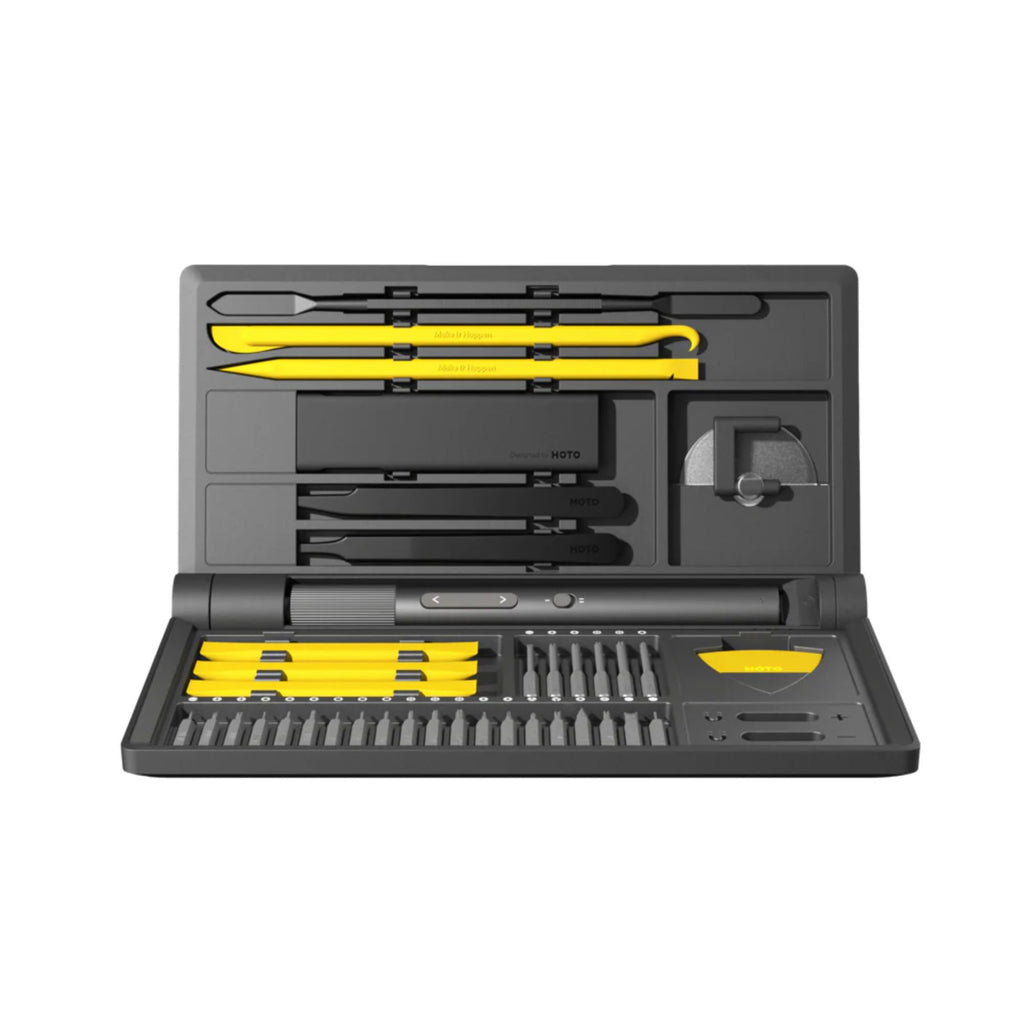 - Practical and portable: HOTO mini electric screwdriver Pro with hinged storage box is only 2.6 cm thick. Compact design makes it fit perfectly in your hand, easy to carry and store. A tool set for professionals and DIY enthusiasts that meets different requirements, no matter daily maintenance or complex repairs