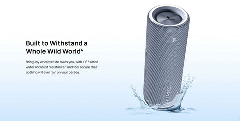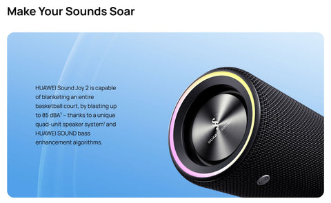 Experience premium portable audio with the HUAWEI Sound Joy 2. This quad-unit speaker system delivers powerful, immersive sound through a 20W racetrack-shaped full-range speaker, 10W tweeter, and dual passive radiators. Enjoy up to 26 hours of continuous playback on a single charge with its 8800 mAh battery, perfect for extended adventures. The innovative shake-to-stereo feature lets you switch between horizontal and vertical sound modes with a simple gesture, while three strategically placed microphones ensure crystal-clear calls from any angle. Built tough with IP67 dust and water resistance, this speaker handles any environment—beach, poolside, or outdoor excursions. Seamless connectivity via Bluetooth 5.2 and NFC one-touch pairing makes setup effortless. Control everything intuitively with dedicated buttons for power, voice, playback, volume, and stereo mode. The responsive ring lights guide you through setup and display music effects in real-time. Compact yet substantial at 700g and measuring 202mm × 73mm, it's designed for portability without compromising on sound quality. Fast charging support (5V/2A, 9V/2A, 10V/4A) gets you back to music quickly. Manage all features through the HUAWEI AI Life app on Android or iOS.