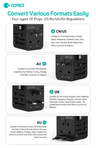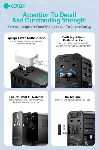 The Coteci 70W GaN Universal Travel Charger is engineered for frequent travelers, combining advanced GaN technology with multi-standard fast charging (PD, PPS, QC3.0). It features two USB-C ports and one USB-A port delivering up to 100W power for efficient charging. Equipped with four interchangeable plugs (US, AU, UK, EU) and a universal socket, it safely supports devices up to 2500W. The built-in auto-retractable 60 cm USB-C cable and cable storage compartment add convenience without clutter. Durable and temperature-controlled, this charger ensures safe and reliable performance worldwide.