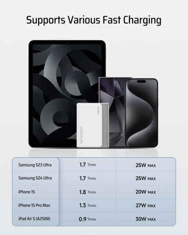 The CUKTECH 10000mAh power bank supports dual 30W USB-C fast charging for both input and output, charging devices like the iPhone 15 from 0% to 58% in just 30 minutes—three times faster than standard chargers. Compact and lightweight at only 195g with dimensions similar to a credit card, it fits easily in pockets or bags for ultimate portability. This powerful charger ensures rapid, reliable power on the go, making it ideal for professionals who need efficient, convenient mobile charging anytime.