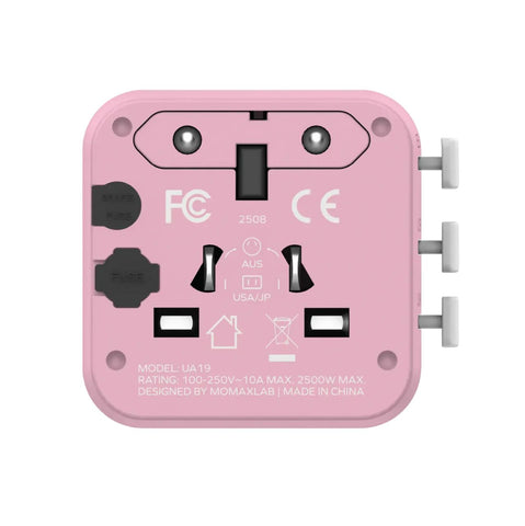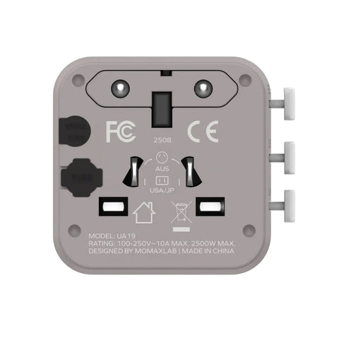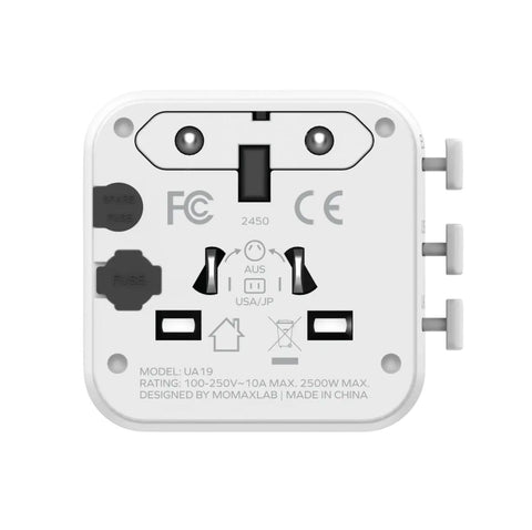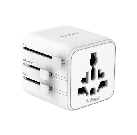 The Momax 1-World Universal Travel Charger supports a wide range of devices, including Apple iOS and Android smartphones, as well as various home and portable electronics. It operates within an input voltage range of 100-240V at 50/60Hz, with a maximum power output of 2500W. Equipped with overload fuse protection and certified by CE, FCC, and RoHS, it ensures safe and reliable use. Constructed from fire-resistant PC material, the charger measures 55.5 x 54.3 x 50 mm and weighs just 98g, combining safety, compatibility, and portability for travelers.