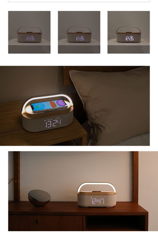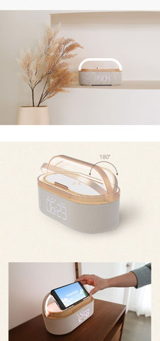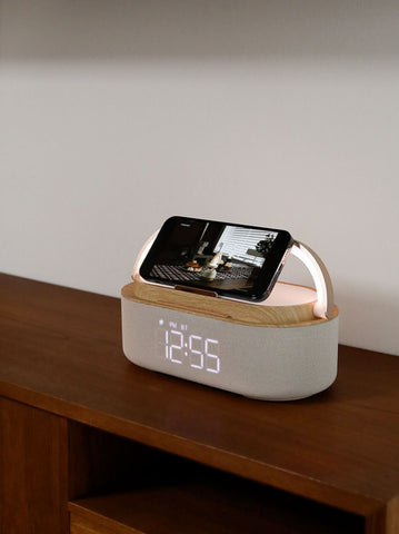 The Sunrise 15W Wireless Charging Speaker Nightlight integrates a Bluetooth speaker, clock, alarm, wireless charger, and adjustable mood light into one sleek device. The LED bar, which can be tilted 180 degrees, allows you to position your phone at the perfect angle while charging wirelessly. Both the mood light and display brightness offer three levels of adjustment for personalized ambiance. Featuring a wake-up alarm with natural sounds, this multi-functional device supports a refreshing start to your day while combining convenience and style with expert design.