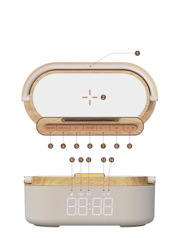 The Sunrise 15W Wireless Charger combines advanced charging technology with versatile audio features. Equipped with an 1800mAh Li-ion battery, it supports efficient wireless charging at 5W, 7.5W, and 10W, ensuring swift power delivery with up to 75% charging efficiency. Enjoy high-quality sound through its 50mm Bluetooth 5.0 speaker, with a wireless range of 10 meters and up to 3 hours of continuous playback. Additional functions include FM radio, an alarm clock, and an LED lamp, all housed in a compact design (23 x 11.6 x 8.9 cm) available in white or wood finish, making it a practical and stylish addition to any workspace or bedside.