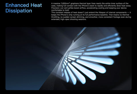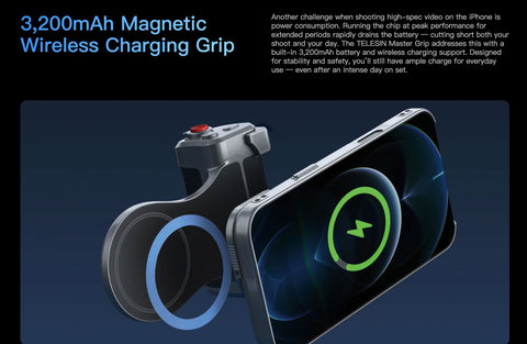 The TELESIN Master Grip for iPhone 17 Pro Max features a graphene case with a 7600mm² heat dissipation layer, enhancing cooling efficiency by 25% compared to standard cases. It includes a built-in 3200mAh battery with fast wireless charging, supporting simultaneous power for your phone and other devices, ideal for extended shooting sessions. The magnetic grip integrates seamlessly with the Telesin Reef Color app, offering continuous OTA firmware updates to optimize your iPhone imaging experience. Designed exclusively for iPhone 17 Pro Max, this grip balances advanced cooling, power, and control for professional creators.