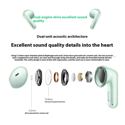 Xiaomi Redmi Buds 7S combine advanced Bluetooth 5.4 technology with a dual-unit acoustic design, featuring a 12.4mm titanium-plated diaphragm and a 5.5mm micro piezoelectric ceramic unit to deliver clear, rich sound. Their 360° surround stereo creates an immersive audio environment, ideal for music and calls alike. Dual microphones with AI noise cancellation ensure crystal-clear voice communication by minimizing background noise. Designed for endurance, these semi-in-ear earbuds offer up to 32 hours of total playback with the charging case, making them perfect for extended use during sports and daily activities.
