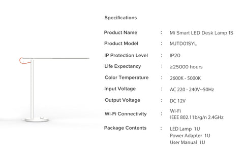 The Mi LED Desk Lamp 1S delivers professional-grade illumination with intelligent control. This white desk lamp features a wide brightness range from 1-100% and adjustable color temperature spanning 2600K to 5000K, allowing you to customize lighting for any task. With a luminous flux of 520 lm and a Ra 90 color rendering index, it provides accurate color representation ideal for detailed work. The energy-efficient 9W LED system operates on 12V with a 25,000-hour lifespan. Seamlessly connect via Wi-Fi (IEEE 802.11 b/g/n 2.4 GHz) using Android 4.4+ or iOS 9.0+ devices for wireless brightness and color adjustments. Rated for 220-240V, 50/60Hz operation, this lamp combines functionality with smart home integration for modern workspace solutions.