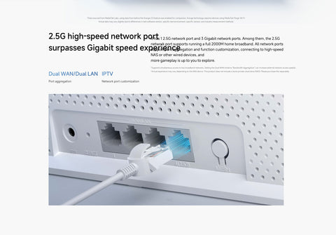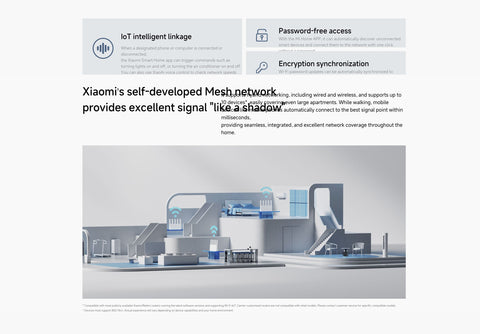 The Xiaomi Router BE5000 integrates a dual-core CPU with 512MB memory to deliver robust performance. It supports WiFi 7 with 2x2 2.4GHz band reaching up to 688Mbps and 3x3 5GHz band at 160MHz delivering speeds up to 4323Mbps. Five high-gain antennas ensure strong signal coverage, while natural cooling maintains stable operation. Connectivity includes one 2.5G adaptive WAN/LAN port and three 1G adaptive WAN/LAN ports, complemented by LED indicators, a system reset button, and a mesh button for easy network expansion. Certified to GB/T 9254.1-2021 and GB 4943.1-2022 standards, it comes with a one-year warranty for comprehensive support.